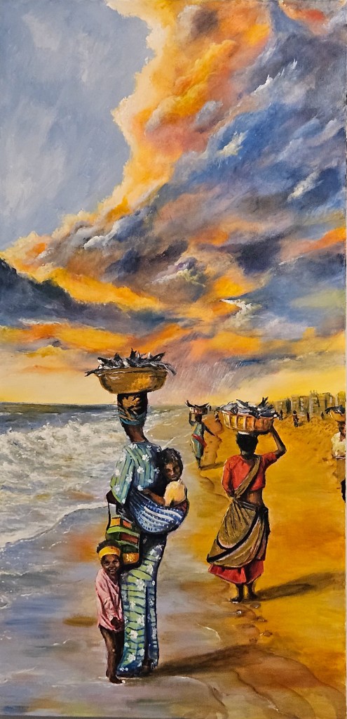 People walk home carrying fish in baskets on their heads as the evening tide of the Atlantic Ocean approaches the shore.