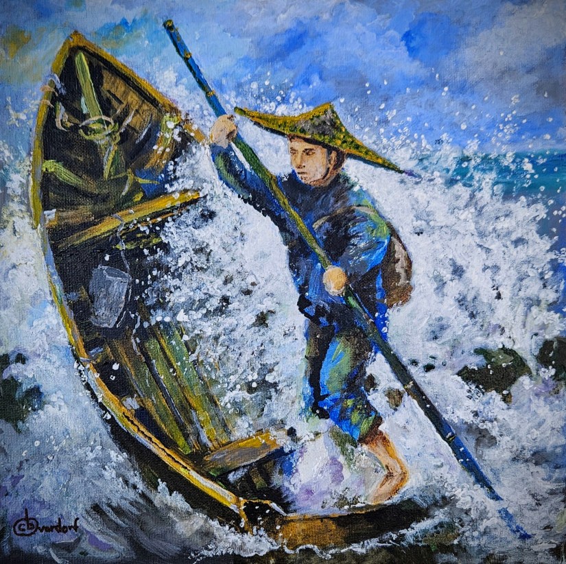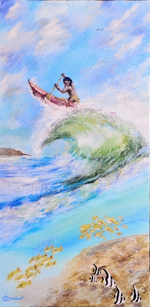 This painting depicts a person in an outrigger atop a cresting wave of adventure.