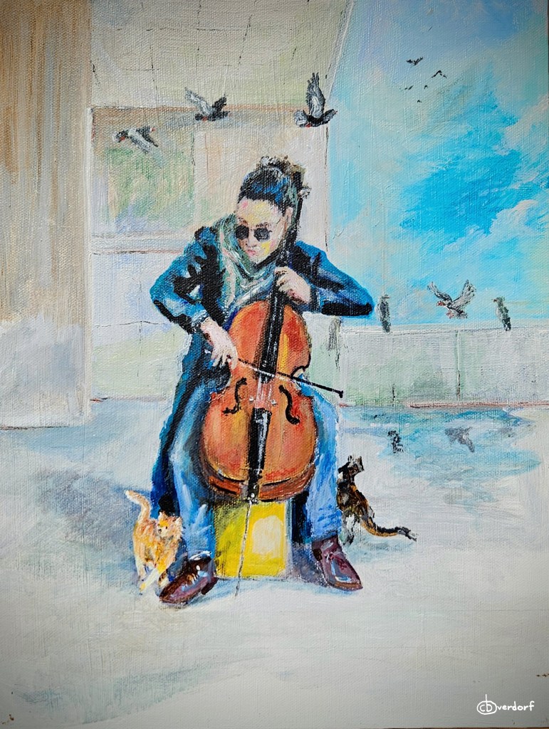 The peaceful solitude of a musician playing the cello surrounded by pigeons and cats evokes emotions and inspiration.