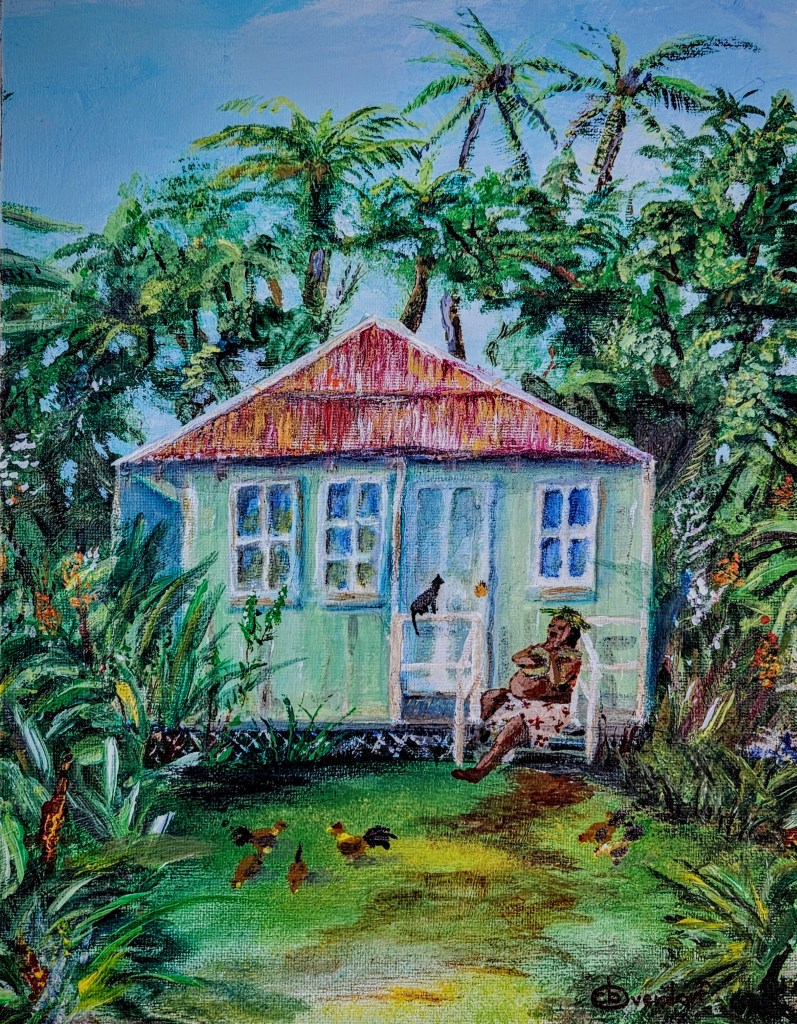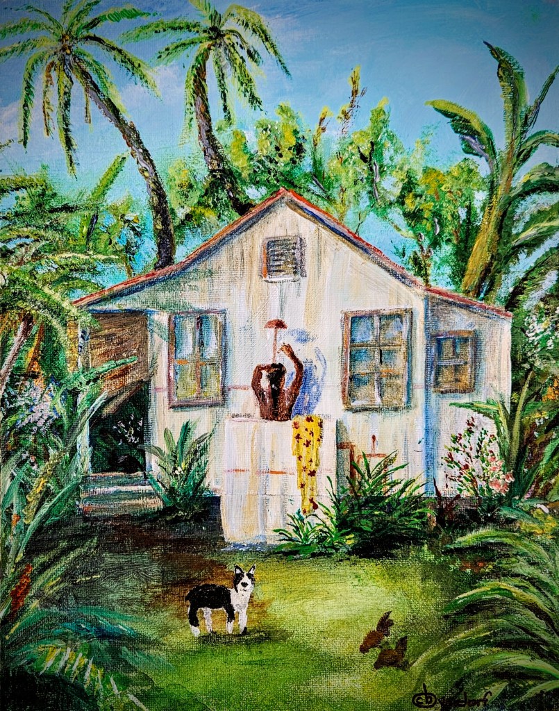 Vibrant depiction of the luxury of a simple life as a girl dances the hula outside in her yard surrounded by lush greenery.