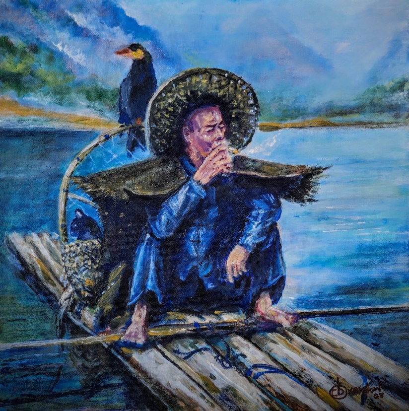 The tranquility of fishing and enjoying a moment of reflection while seated on a bamboo raft, accompanied by a cormorant.