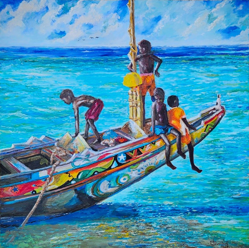 Vibrant painting of Senegalese children playing on a colorful boat beached on a sand bar with the serene blue Atlantic Ocean as the backdrop.