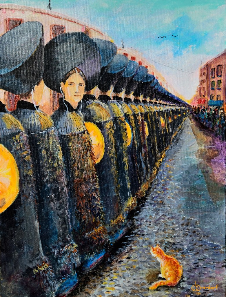 A row of priestly women in traditional attire in a revant parade with a curious cat sitting in the foreground.