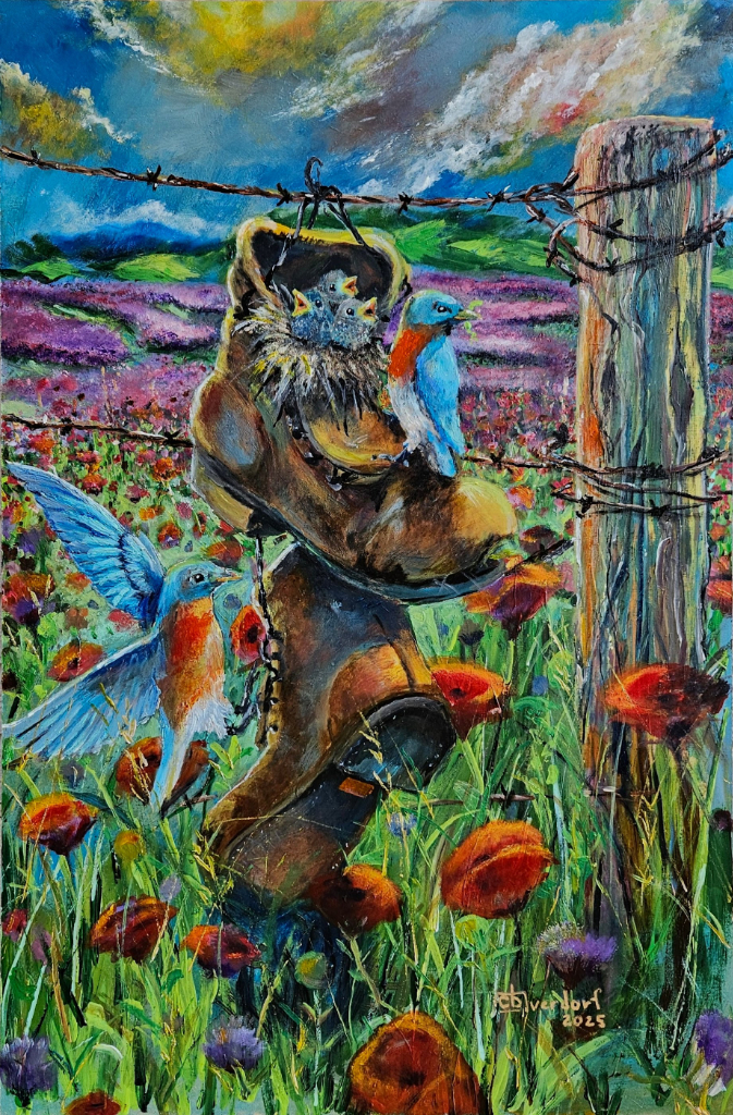 Inspired by a poem created during the First World War by Canadian physician Lieutenant-Colonel John McCrae. Featured are combat boots hanging off barbed wire, symbolizing the end of one’s service to the military. The post is the division of land and people resulting from a battle. The combination of poppy flowers and lavender symbolizes a powerful harmony of remembrance and peace, or the idea that one finds serenity and healing after strength and sacrifice. Finally, the Eastern Bluebird symbolizes happiness, hope, love, and renewal.