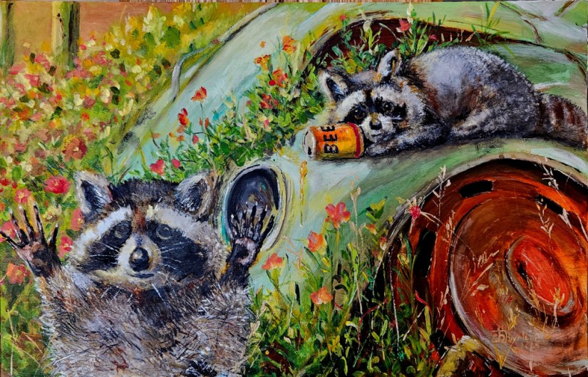 A playful protest of the effect humans have on wildlife as they encroach on nature. Exhibited. Art Gone Wild show, The Kelly Fitzpatrick Center for the Arts, 2025