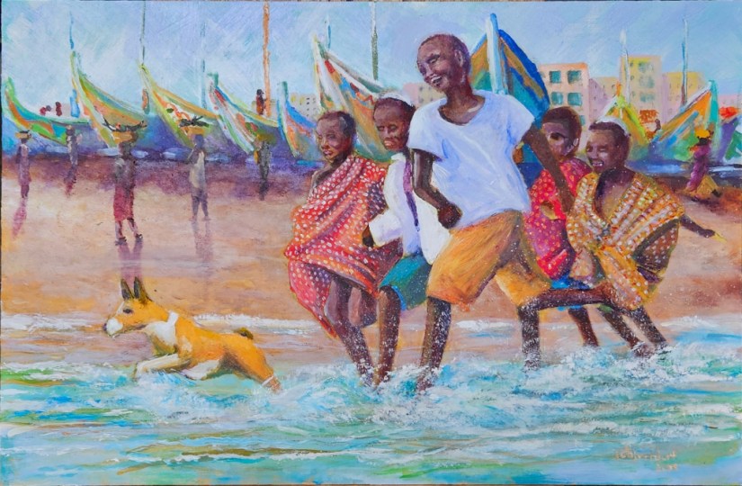 Senegalese children chasing a bengi dog through the rising tide, in front of a backdrop of colorful fishing boats